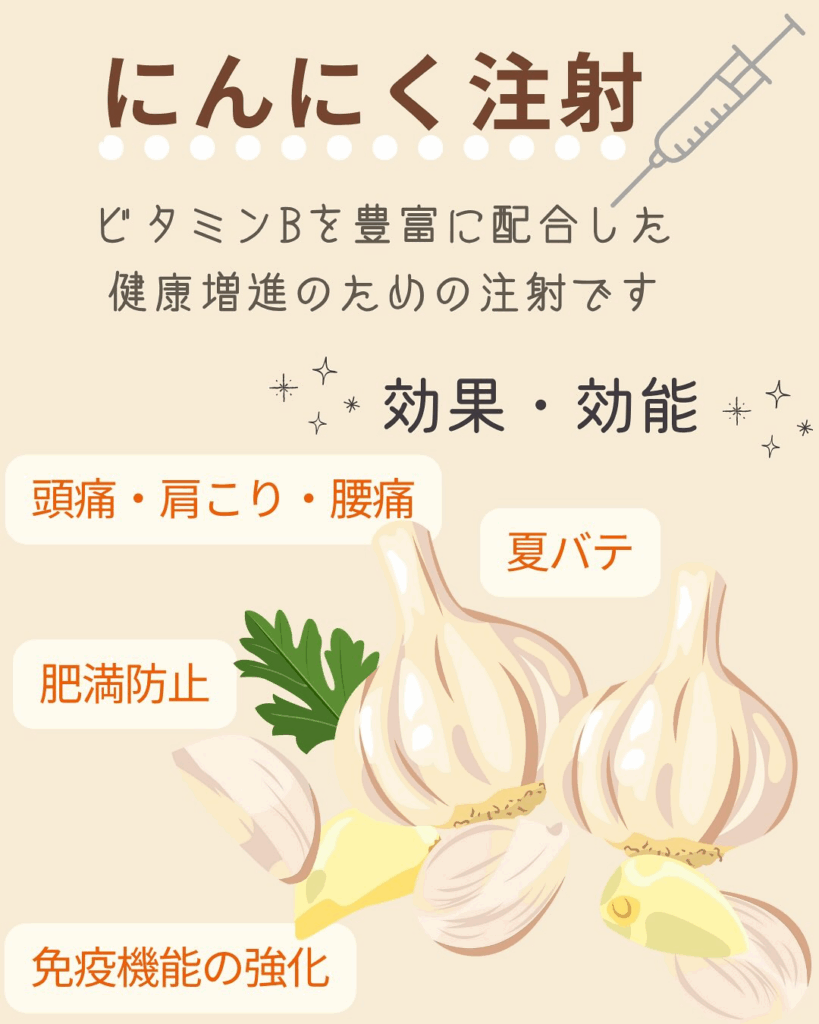 にんにく注射は、にんにくに豊富なビタミンB1などの栄養素を含むこと、健康や美肌の増進に効果的であること、注射後に少しだけにんにくの匂いを感じる場合があることなどから、一般的ににんにく注射と呼ばれています。