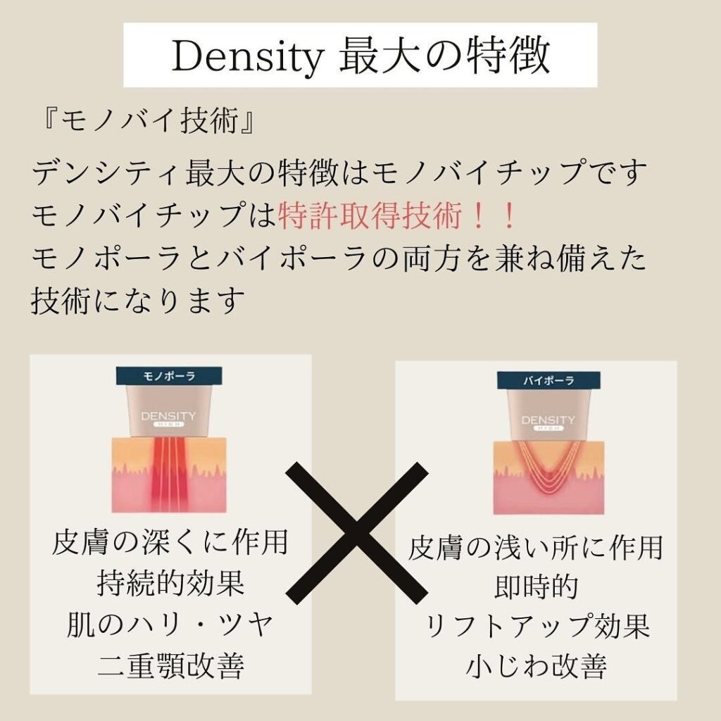 デンシティとは、肌の深部を引き締めることで持続的な効果を発揮するモノポーラと、肌表面を引き締めることで即時的な効果を発揮するバイポーラという2つの高周波(RF)を照射できる最新のたるみ治療機器です。