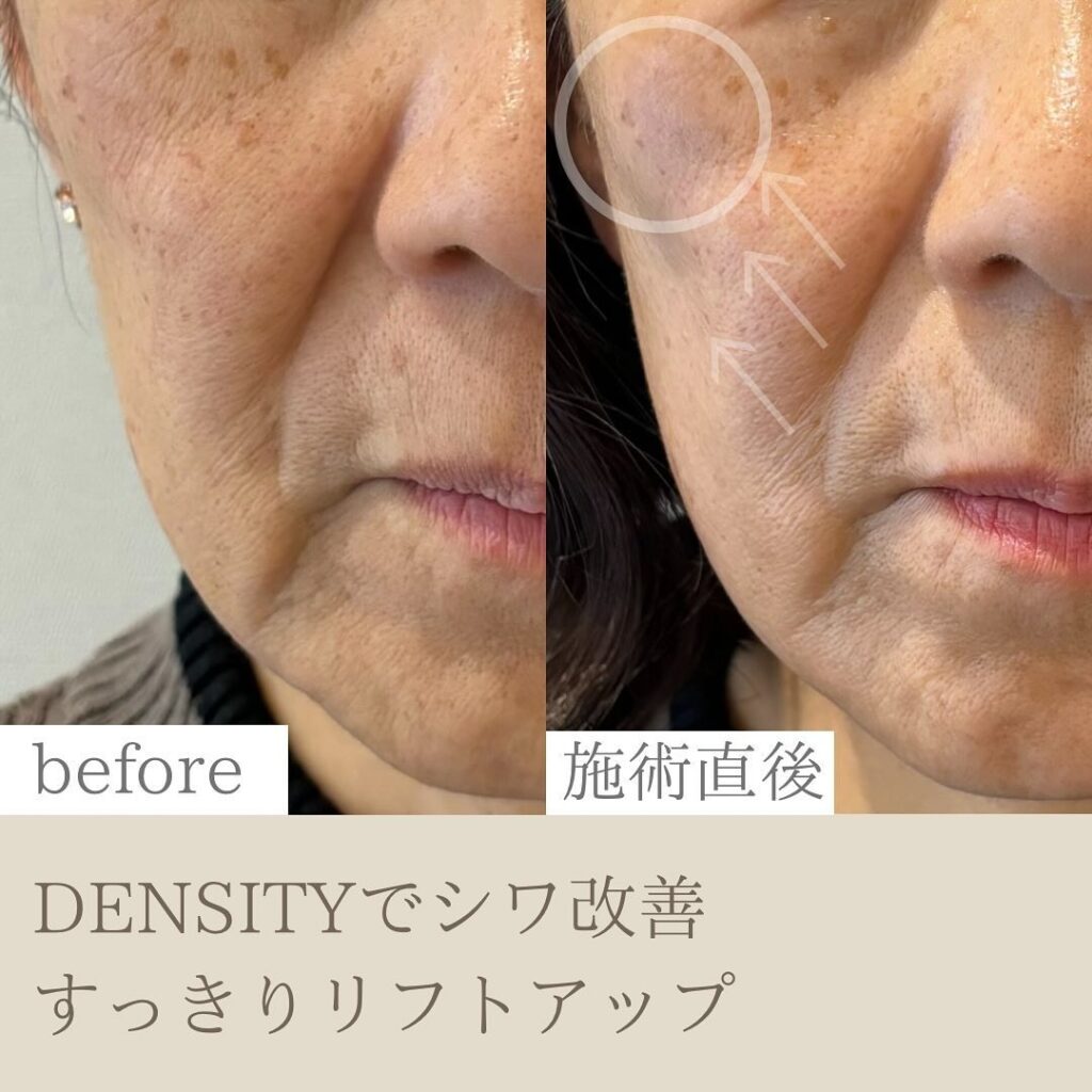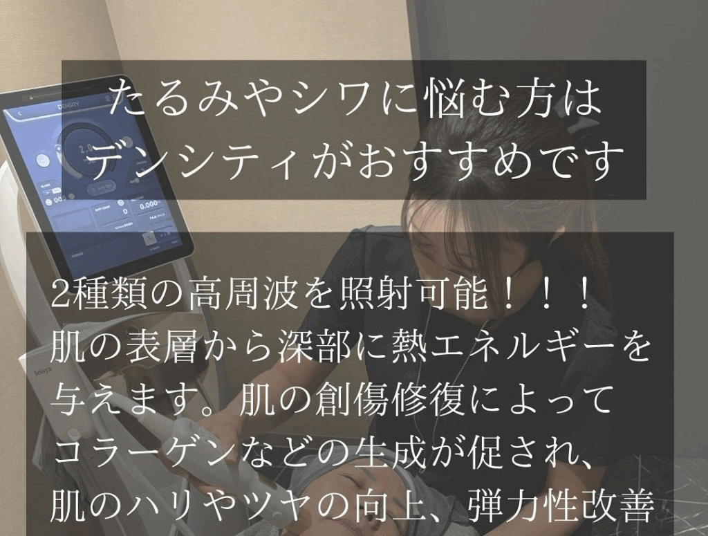 デンシティは、高周波(RF)を肌に照射することで、小じわやたるみを改善する最新の美肌治療機器です。メスで肌を切らずにリフトアップできるので、痛みやダウンタイムはほとんどありません。目元専用のチップに切り替えることで、目元の小じわや目の下のたるみなどを改善する効果も期待できます。