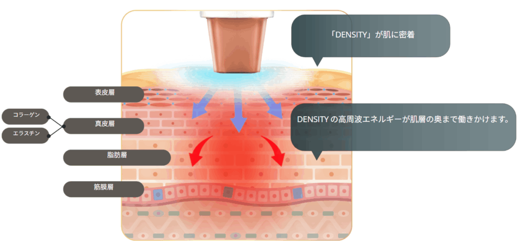 デンシティは、6.78Mhzの高周波(RF)を最大出力400Wという強力なパワーで照射できるため、肌の内側まで熱エネルギーを届けることができます。そのため、肌内部の組織を引き締めるだけでなく、コラーゲンやエラスチンなどの美肌成分の生成も促進し、肌のトーンアップ効果も。