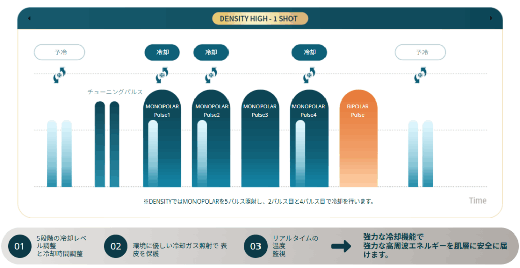 また、デンシティのクーリングシステムは、5段階で冷却レベルと冷却時間を調整できるので、患者さまの肌質や痛みの感じ方に応じた丁寧な施術が可能です。高周波の照射に合わせて冷却ガスが自動的に噴射されるので、痛みや火傷のリスクを最小限に抑えられます。