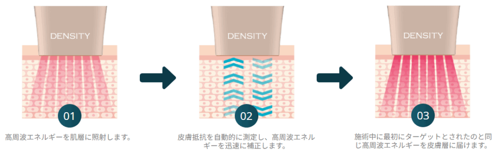 デンシティのインピーダンスシステムは、高周波エネルギーの照射ごとに実際の皮膚の抵抗値を測定し、自動的に最適な出力に調整する機能です。これにより、常に最適なエネルギーで高周波を照射できるので、安全でムラのないたるみ治療ができます。