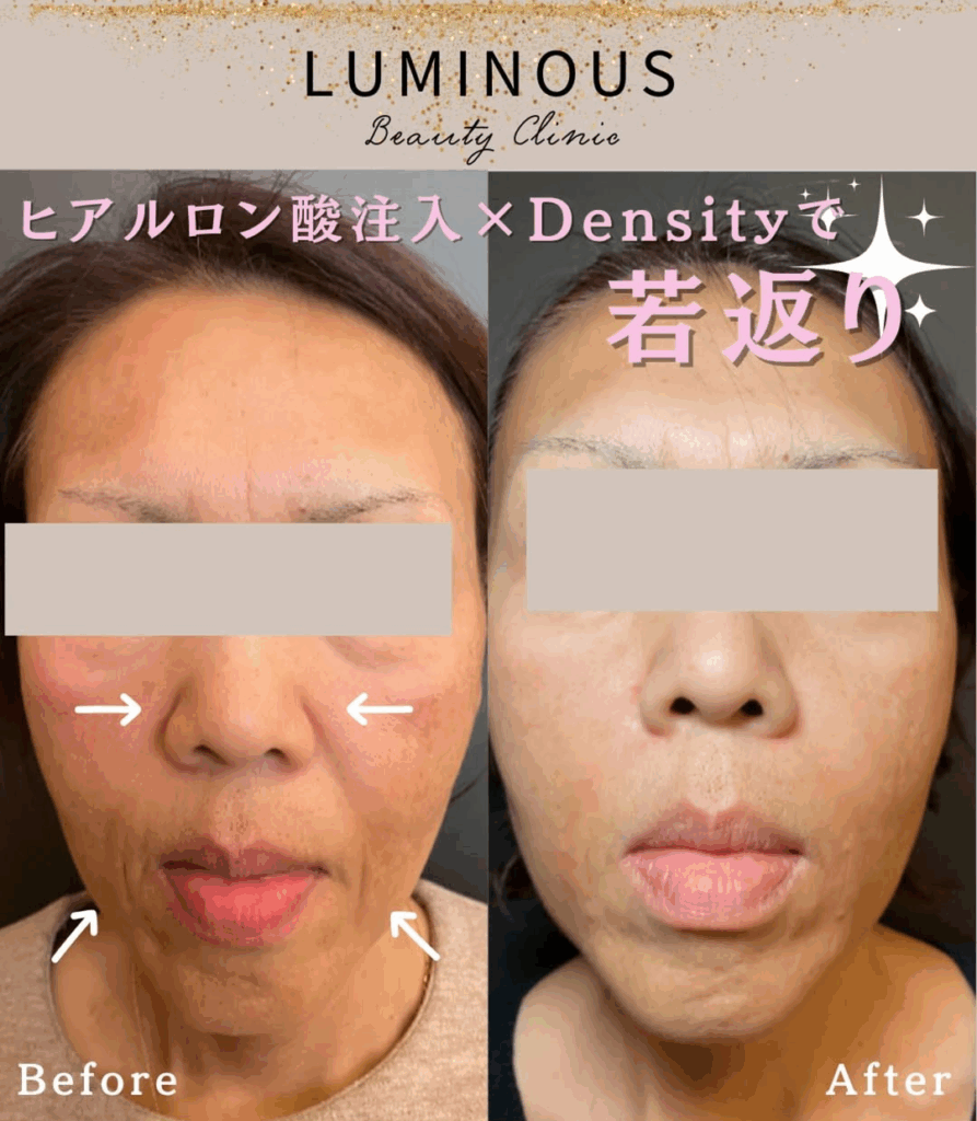 ヒアルロン酸注入による肌のハリツヤ感のアップと、デンシティによる美肌成分の生成促進効果も相乗的に作用しますので、小じわやたるみ、目の下のくぼみ、骨やせ感などのエイジングケアにもおすすめ。若々しい美肌をできるだけ長くキープしたい方は、ルミナスビューティークリニックの多彩な美肌治療メニューの組み合わせをご検討ください。