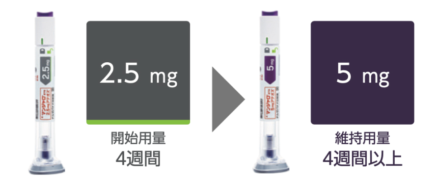 2~4回目の投与が終わりましたら、症状や体重変化の確認のために診察を行いますのでご来院ください。引き続き、週1回2.5mgの投与を続けるかを判断します。また、患者さまの症状や体重の変化に応じて、週1回5.0mgへの変更を検討します。