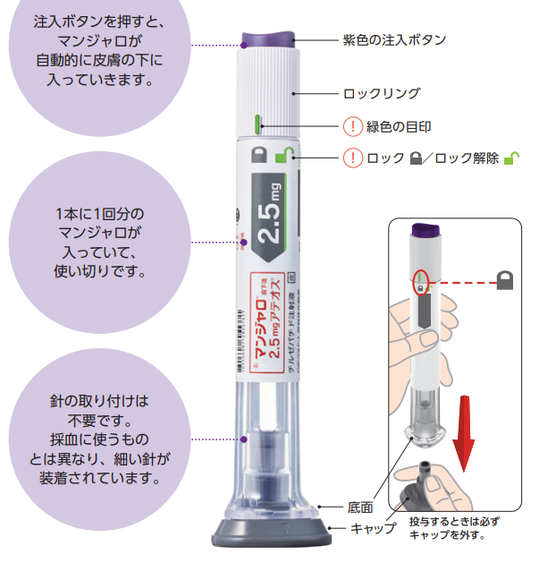 注入時にはチクッとした痛みを感じる場合がありますが、患者さま自身がご自宅で手軽に2型糖尿病の治療を行えるというメリットがあります。
