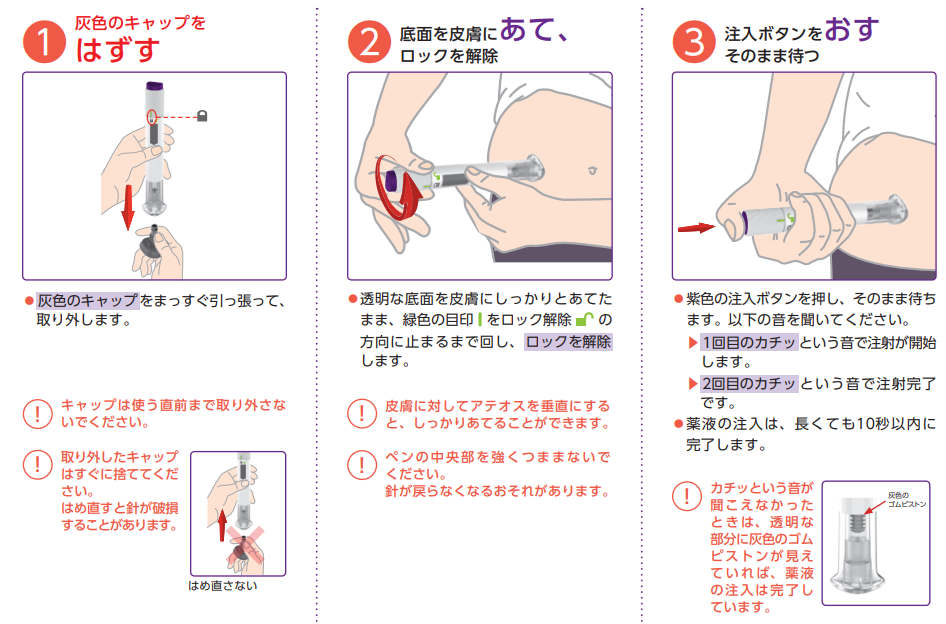 1回目のカチッという音で薬液の注入が始まり、2回目のカチッという音で注射が完了します。チクッとした痛みを感じる場合がありますが、すぐに痛みは治まります。ご自身で注射するのが不安な方は、別途有料にて当院で注射することもできます。