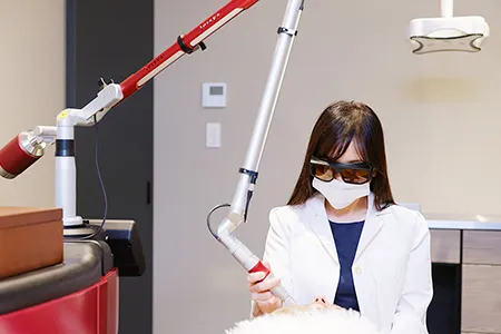 レーザートーニングは、低出力のレーザーを肌にまんべんなく照射し、色素沈着の原因であるメラニン色素をゆるやかに破壊する治療機器です。刺激の少ないマイルドなレーザーを使うため、目の周りのような皮膚の薄い部分のシミ治療に最適です。