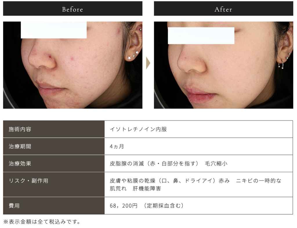 イソトレチノインの内服には、肌の乾燥や皮むけなどの副作用が起きる可能性があるため、医師の指導のもとで進めていきます。また、定期的に採血も行いながら、体調や症状を確認していきます。