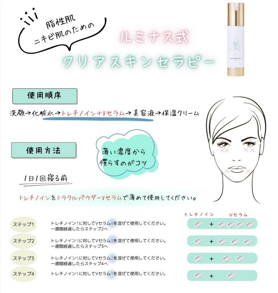 ルミナスビューティークリニックでは、ドクターズコスメとして人気の高いAt.のミラクルパウダーVセラムと組み合わせた「クリアスキンセラピー」のご提案も可能です。ニキビ肌や脂性肌の改善におすすめ。美白効果や毛穴の引き締め効果も期待できます。