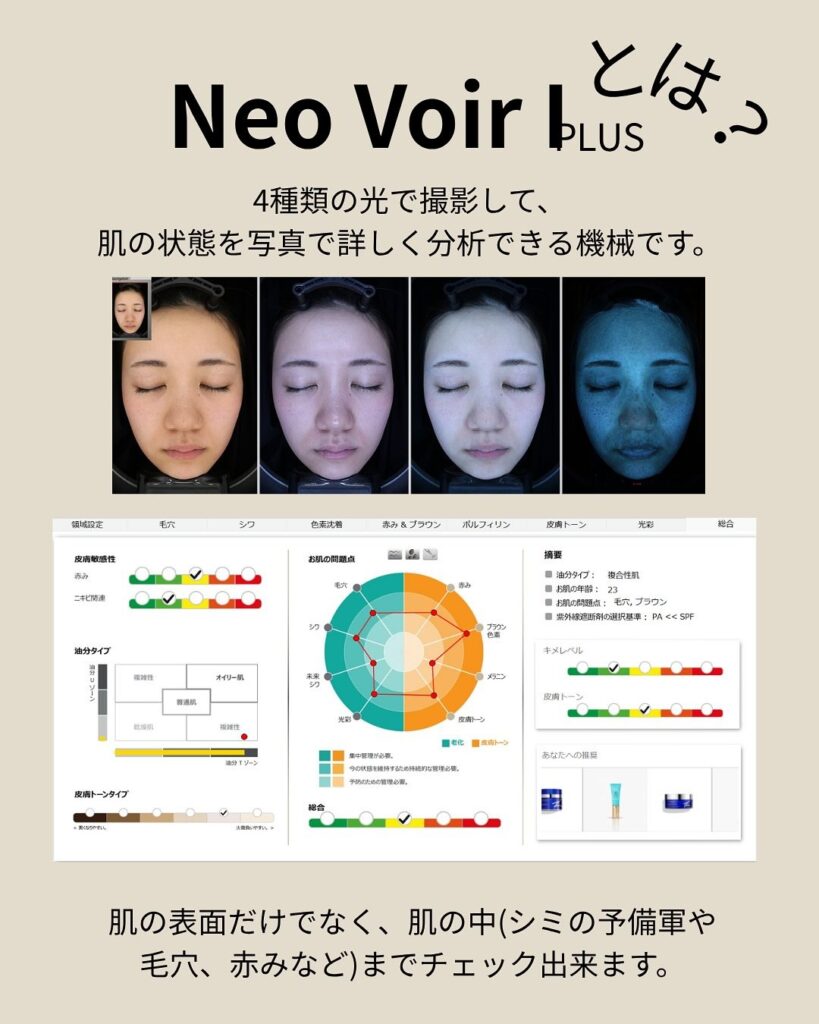 ニキビの原因や患者さまの肌質を分析するために、当院では最新のAI肌診断機「ネオヴォワール」を導入しています。4つの光源を使い分けて高解像度カメラで撮影し、その画像をAIが分析することにより、肉眼では確認が難しい肌の内側の状態も把握することができます。また、肌表面の水分量測定とは異なり、肌内部の皮脂腺の多い/少ないがわかります。