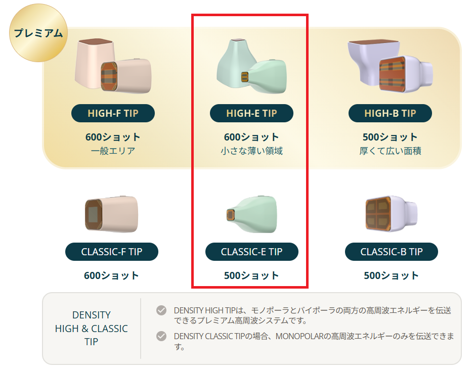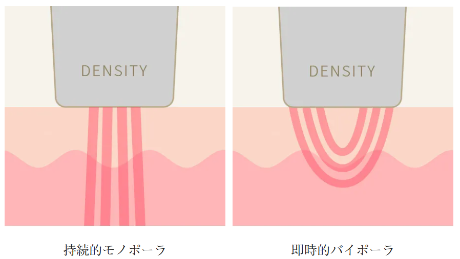 デンシティは、モノポーラとバイポーラという2種類の異なる高周波を照射し、たるみの引き締めやしわの改善が行える最新の美肌治療機器です。強力な高周波を肌組織の内部に照射し、その熱エネルギーの力でたるんだ皮膚組織が収縮し、たるみやしわが改善されます。
