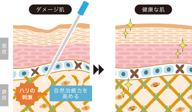 スネコス注射は、特別な比率で配合されたヒアルロン酸とアミノ酸が、肌を内側から支える細胞外マトリクスという組織の再生を促します。細胞外マトリクスが再生されることで、コラーゲンやエラスチンを産生する線維芽細胞が活性化し、肌本来の潤いや弾力を回復させる効果が期待できます。
