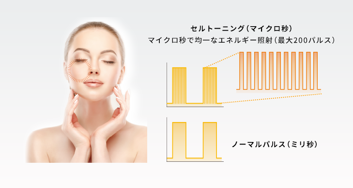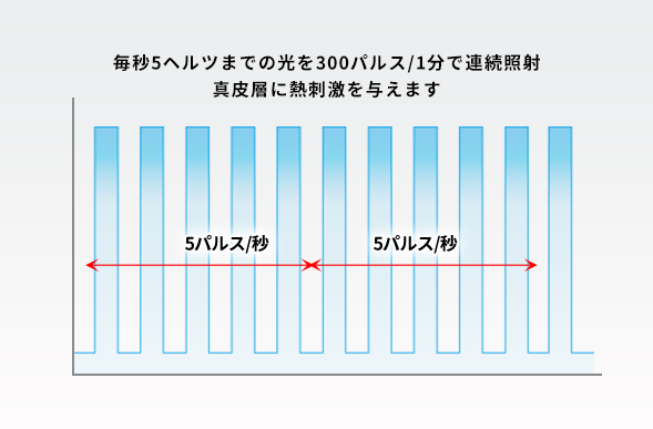 毎分300パルスで連続照射するフォトシャワー™テクノロジーは、アクネ菌の殺菌(ニキビの改善)やブライトニング(シミ・そばかすの改善)、セミ・リフティング(毛穴の引き締めやたるみの改善)などに効果を発揮するモードです。毎秒5Hzまでの光を連続照射することができるので、真皮層にまで熱刺激を伝えることができます。