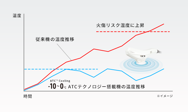 独自のリアルタイム表皮温度モニターシステム「ATC™テクノロジー*」を搭載することにより、施術時の痛みを軽減します。-10℃の強力冷却によって施術中の照射面の温度を0〜5℃に保つことで、火傷などの副作用のリスクを減らし、より高出力でターゲットとなる病変を照射できます。