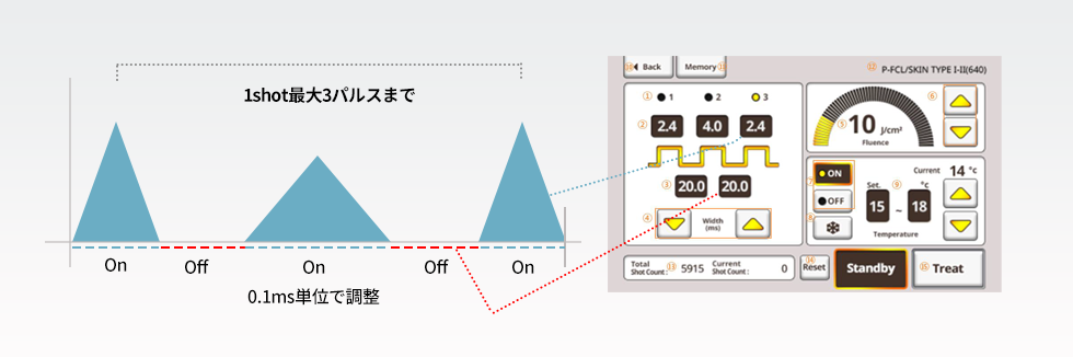マルチパルスモードは、1ショットあたり最大3パルス、パルスピークタイム・バレータイム(ONtime/OFFtime)を0.1ms単位で自在に調整できるモードです。患者さまの症状や痛みへの反応などを見ながら、最適な出力で治療を行うことができます。