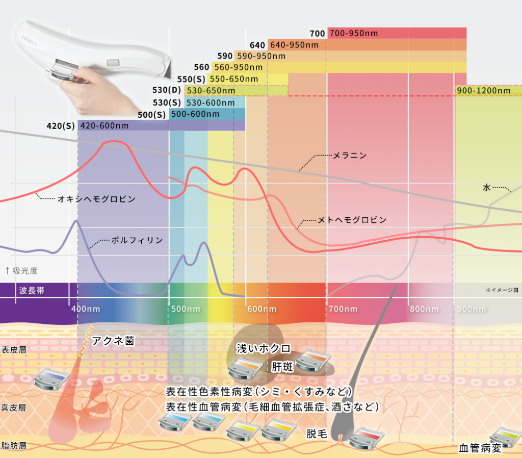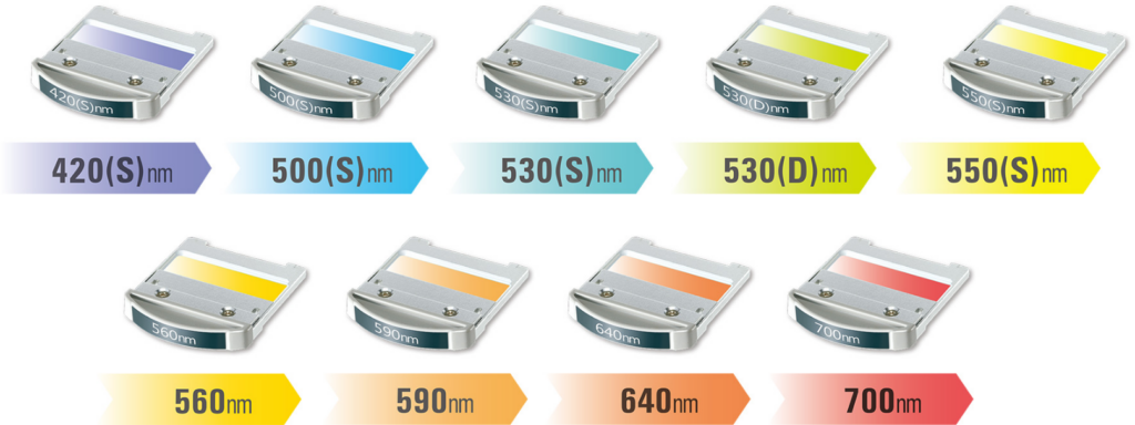 セレックVには、ヘモグロビン・メラニンに高い吸収特性をもつ波長帯(420nm~1200nm)をターゲットとすることができる9種類の交換可能なハンドピースフィルターが用意されています。患者さまの症状やお悩みに合わせてハンドピースフィルターを交換することで、多彩な治療が行えるだけでなく、的確な深度でIPLを照射できるため、施術時の高い安全性を確保できます。