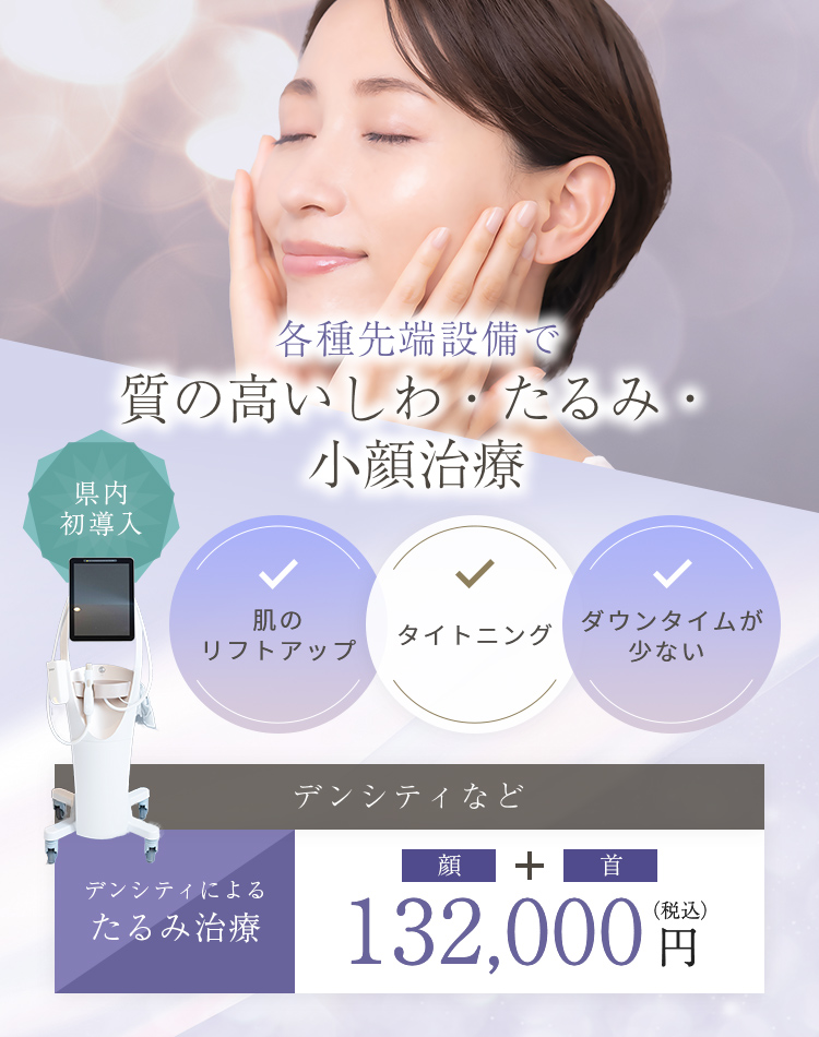 当院は、県内で初めてデンシティを導入したクリニックです。デンシティは高出力のRF(高周波)を照射することが可能であり、肌のコラーゲンや繊維組織の収縮によってリフトアップ効果が期待できます。しわやたるみの改善、小顔効果を得たいかたへ、質の高い治療をお届けいたします。